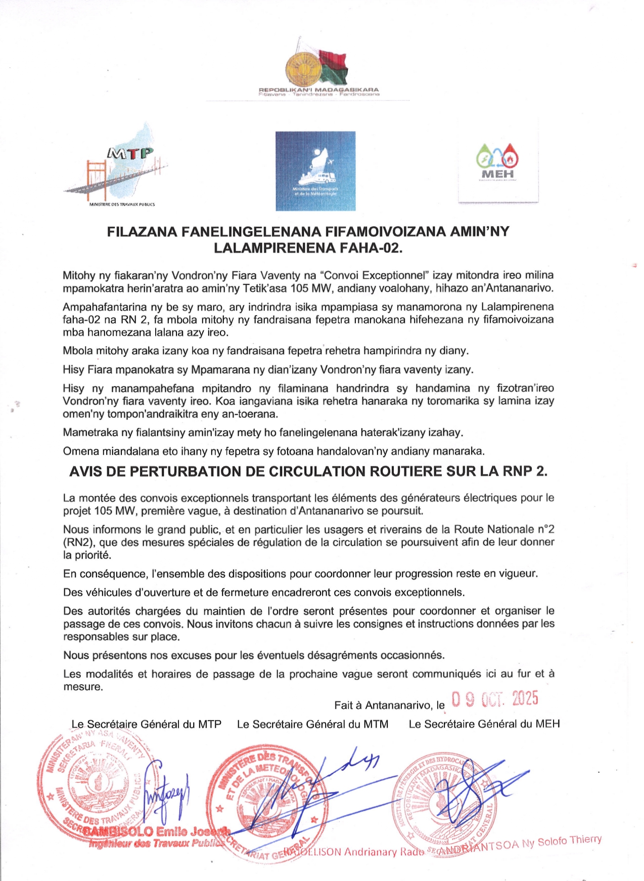 Manentana ny mpampiasa làlana rehetra ny Minisiteran’ny Asa Vaventy mba hitandrina rehefa mandalo amin’ity faritra ity mba hisorohana ny loza mety hitranga. Ny fiarovana ny rehetra no laharam-pahamehanay.