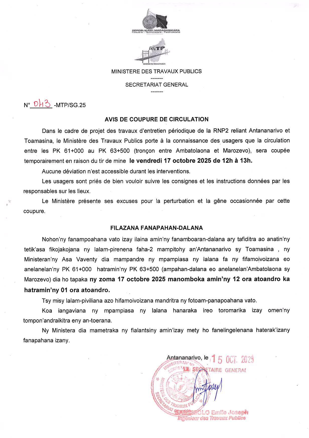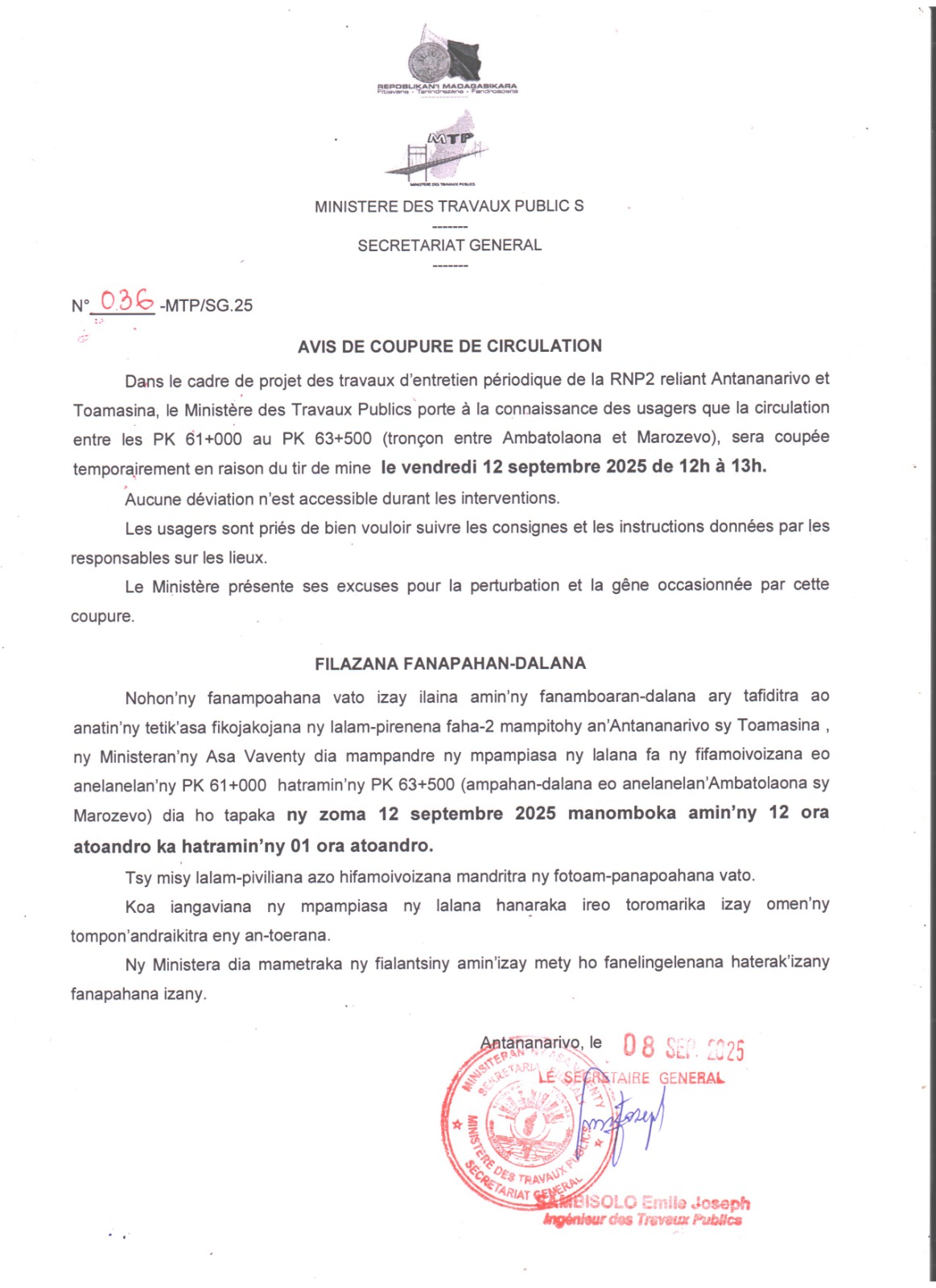 Manentana ny mpampiasa làlana rehetra ny Minisiteran’ny Asa Vaventy mba hitandrina rehefa mandalo amin’ity faritra ity mba hisorohana ny loza mety hitranga. Ny fiarovana ny rehetra no laharam-pahamehanay.