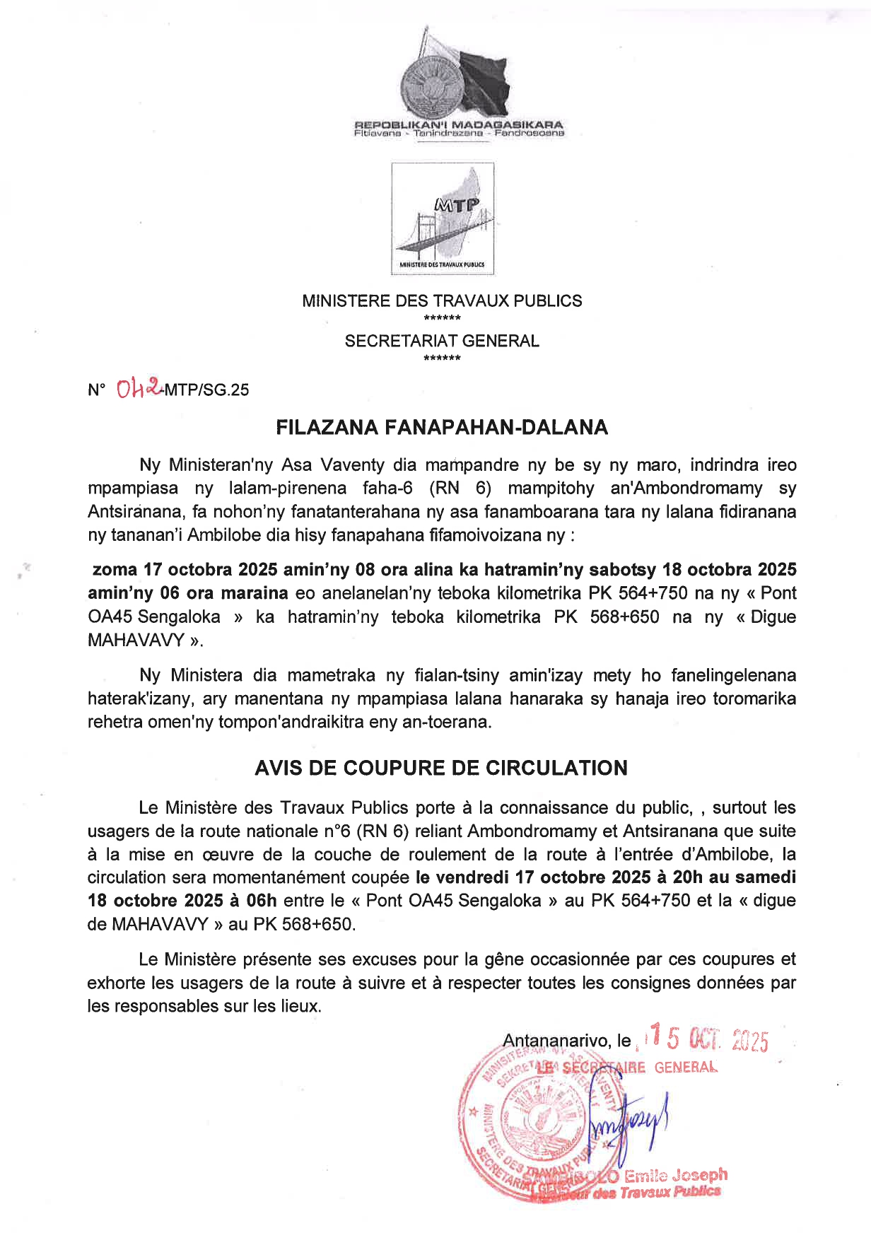 FILAZANA FANAPAHANA FIFAMOIVOIZANA RN6: PK 688 + 700 ny Talata 6 Mey 2025 amin'ny 7 ora maraina hatramin'ny 8 ora sy sasany